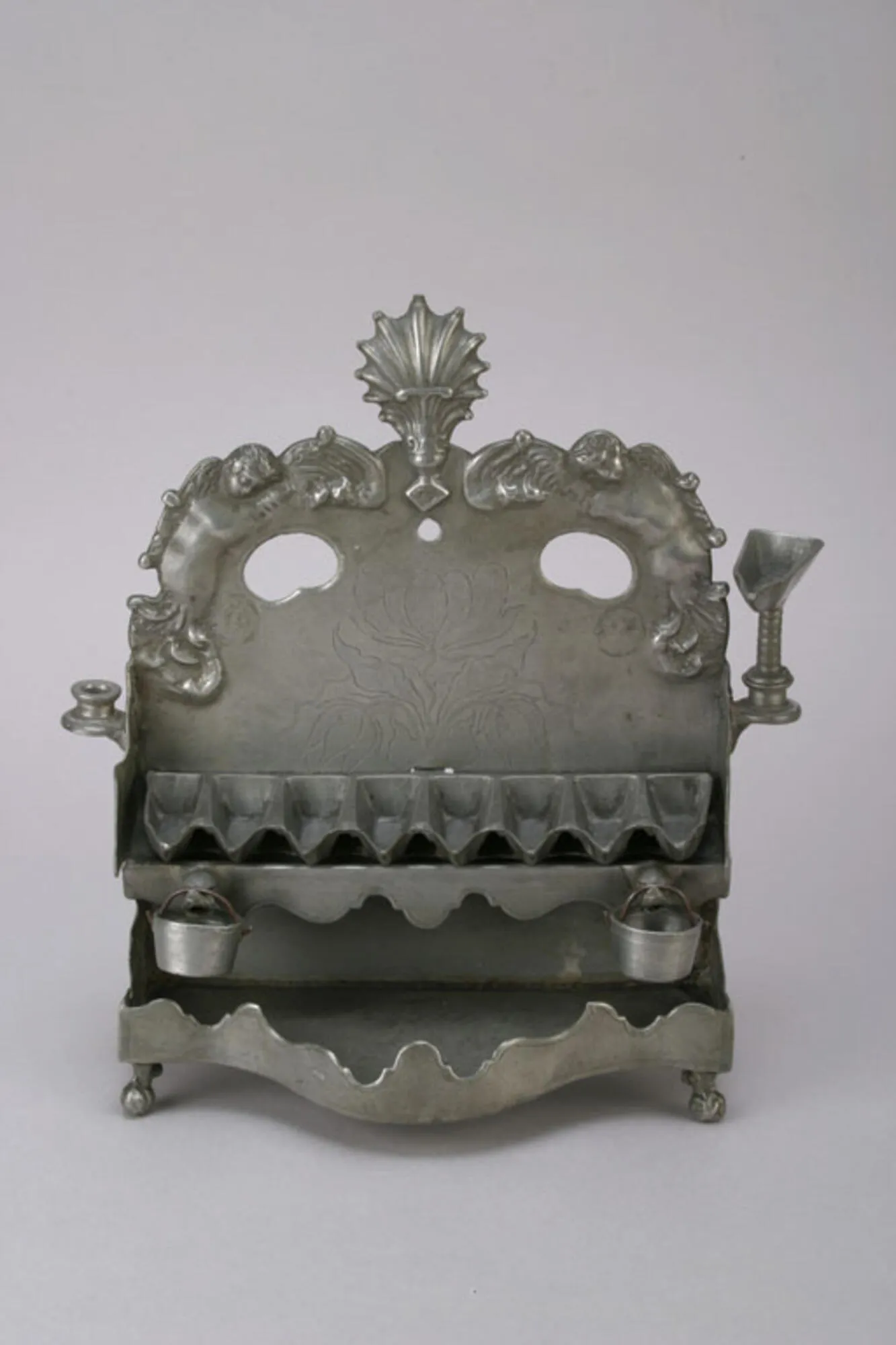 Bei dieser schweren Chanukka-Lampe aus Zinn handelt es sich um den sogenannten Typus 18. Jahrhundert aus Horb am Neckar. Es ist eine Nachbildung aus dem 19. oder frühen 20. Jahrhundert aus der Feingießerei August Weygang in Öhringen bei Stuttgart. Die schwere Chanukka-Lampe aus Zinn besitzt eine Rückwand, die oben mit zwei einander gegenübergestellten geflügelten Rokoko-Putti versehen ist, sowie in der Mitte mit Voluten und einer aufrechten Muschel in einer Vase. Eine runde Öffnung, die vielleicht zum Aufhängen der Lampe diente, wenn diese nicht benutzt wurde. Über der Ölpfannenreihe ist auf der Rückwand eine geöffnete Rose graviert und gepunzt. Die Ölpfannen sind aus einem Stück gegossen und mit einem Zapfen versehen, der durch einen Schlitz in der Rückwand reicht. Die beiden Teile werden durch einen neuen Nagel zusammengehalten. Die nach vorne schnabelförmig zugespitzten Ölpfannen sind über einer Tropfschale angebracht. Die bogenförmig ausgezackte Vorderseite der Tropfschale ist mit einer Punzierung in Form von Rhomben versehen. Parallel zum Rand verläuft eine gravierte Linie. Zwei Miniatur-Eimer mit Stahlgriffen hängen auf Abflussröhren in Form von Delphinköpfen, die an die Vorderseite der Tropfschale angelötet sind. Die Eimer sind für das überschüssige Öl gedacht, das durch die Delphinköpfe abfließen kann, vielleicht auch für abgebrannte Dochte. Ursprünglich standen wohl zwei weitere, mit einem angehobenen Fuß versehene Ölnäpfe in Stützen, die sich an den Seiten der Rückwand befinden; der Ölnapf auf der linken Seite fehlt. Einer ist für den Diener (Schamasch) gedacht, der andere vielleicht für eine Schabbat-Kerze. Die Ölpfanne des Schammasch ist an ihren säulenartigen Sockel angelötet. Vielleicht wurde die Stütze später hinzugefügt oder nur die Lötung erfolgte später. Unter der Ölnapfreihe und der Tropfschale ist eine balkonartig in leichter Wellenform vorschwingende Schale angebracht, die auf Löwenfüßen steht. Sie besitzt einen bogenförmigen Rand mit einer schlichten gravierten Verzierung und dient als Stabilisierung. Die Seitenwangen sind mit einer Zick-Zack-Gravur entlang der Ränder versehen, die entlang der Stütze für den Schammasch und um sie herum verläuft.