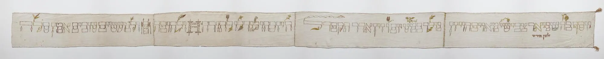 Tora-Wimpel bezeichnet ein meist verziertes Stoffband, welches um die Tora gewickelt wird. Der Tora Wimpel war für Joseph Zwi aus der Landjudengemeinde Aufhausen im Jahr 1823. Der Spruch er wachse heran zur Tora, zur Chuppa und zu guten Werken wird durch eine Torarolle und einen Hochzeitsbaldachin illustriert. Die Torarolle verweist auf die Zeremonie der Bar Mitzwa, bei der der Junge erstmals zum Lesen der Torarolle aufgerufen wird, der Hochzeitsbaldachin deutet auf die Gründung einer neuen Familie und die guten Taten drücken die Aufforderung aus, zum Gemeindeleben durch Wohltätigkeit beizutragen. Die Buchstaben wurden sorgfältig in einer altertümlichen Quadratschrift vorgezeichnet und dann mit Stielstich in verschiedenfarbigen Seidengarnen nachgestickt. Der Vorzeichner war in der Regel ein ausgebildeter Schreiber für rituelle Texte, während die Stickerei von weiblichen Familienangehörigen ausgeführt wurde.